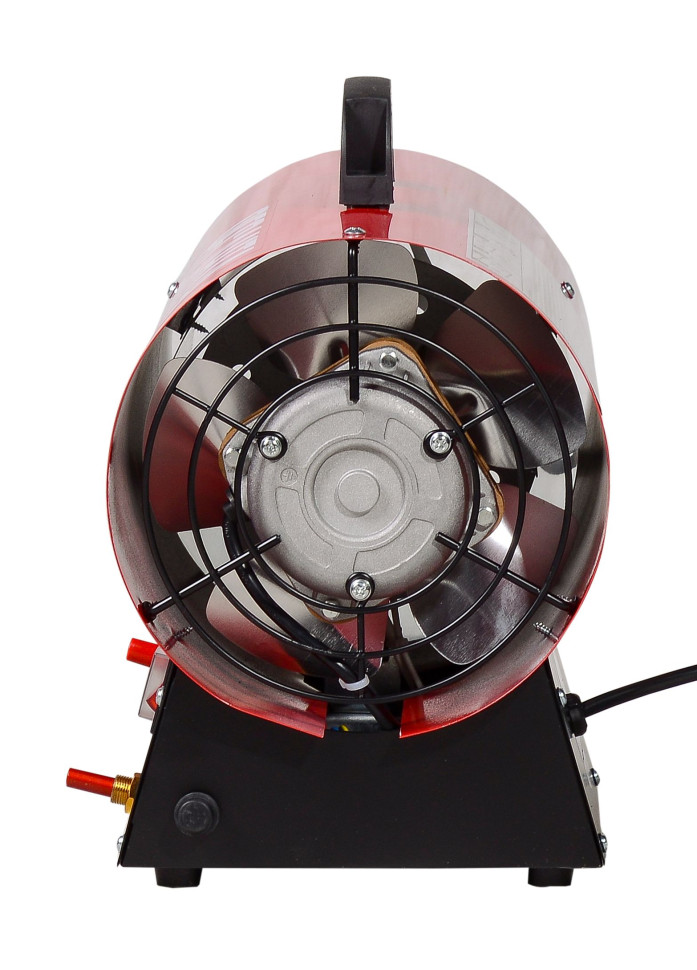Теплопушка работает на сжиженном газе. Это может быть пропан, бутан или смесь пропан-бутан. Модель оснащена пьезоэлектрическим элементом для удобного розжига топлива, регулятором давления, биметаллическим термодатчиком для контроля пламени, имеет защиту от перегрева. В случае угасания пламени газ сразу перестает поступать в горелку, при нагреве до критической температуры +110 градусов автоматически отключается электрика. Принцип работы тепловой пушки заключается в подаче в устройство холодного воздуха посредством мощного вентилятора, его нагреве и последующем перемешивании холодных и горячих потоков для быстрого обогрева окружающего пространства. При необходимости подачу топлива можно перекрыть и использовать устройство для вентилирования помещения. Газовая теплопушка весит 4,8 кг и для более удобной переноски оснащена ручкой.