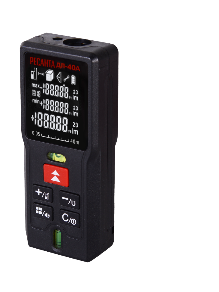 Установка точки отсчета измерений. Можно производить измерения от нижней части прибора, верхней части или с позиции винта штатива.Резьба для крепления к штативу 1/4 дюйма (подходит к большинству штативов для фото и видео оборудования).Установка единиц измерения. Информация может выдаваться в метрах, дюймах, десятичных и дробных футах.Можно сохранять до 20 значений в памяти устройства.Автоматическое вычисление площади, объема, третьей стороны прямоугольного треугольника.