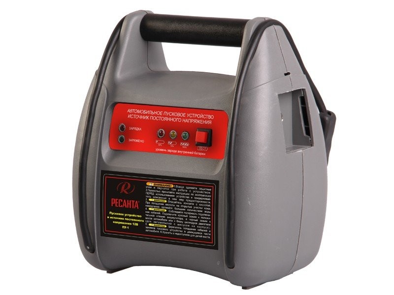 Пусковое устройство РЕСАНТА ПУ-1идеально подходит для пуска любых двигателей внутреннего сгорания, оборудованных электростартером (автомобилей, катеров, мототехники, двигателей генераторов и т.д.). Полностью совместимо с любой 12-вольтовой пусковой системой. Устройство использует встроенный аккумулятор, не требующий техобслуживания, что позволяет хранить его в любом положении без риска утечки кислоты.Имеет индикатор заряда внутреннего аккумулятора, оборудовано розеткой «под прикуриватель» для подключения потребителей на 12В. Есть два несъемных зажима длиной 35см. Устройство для зарядки входит в комплект поставки. С помощью кнопки «Тест» можно проверить заряд встроенного аккумулятора. Есть USB-порт для зарядки телефонов.