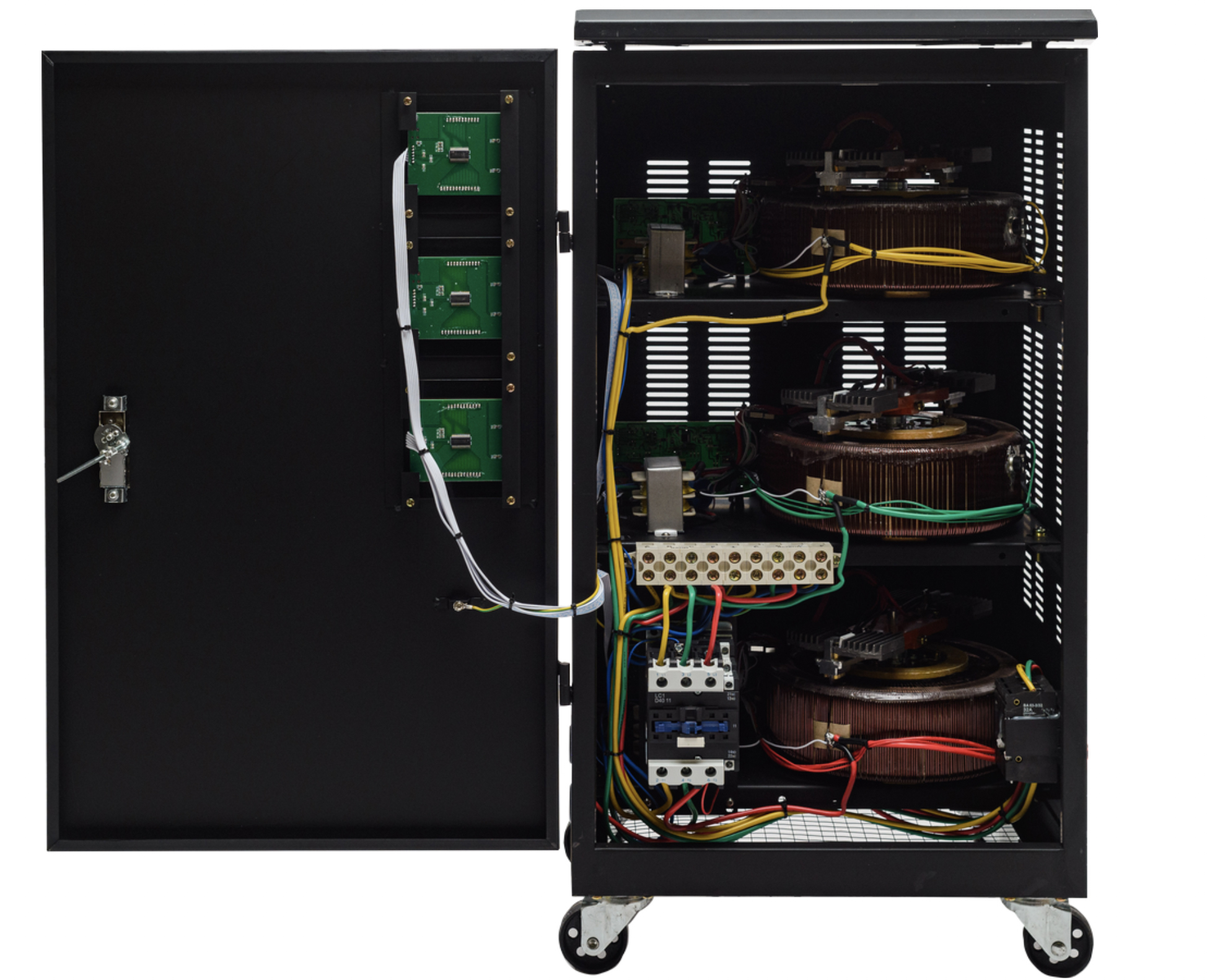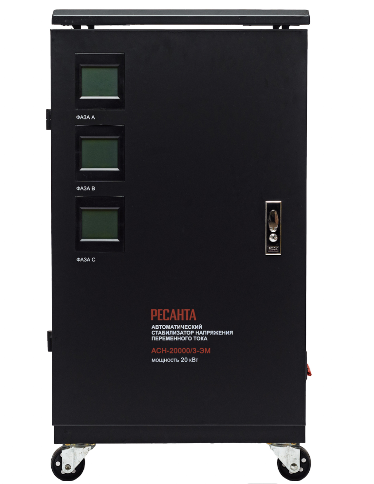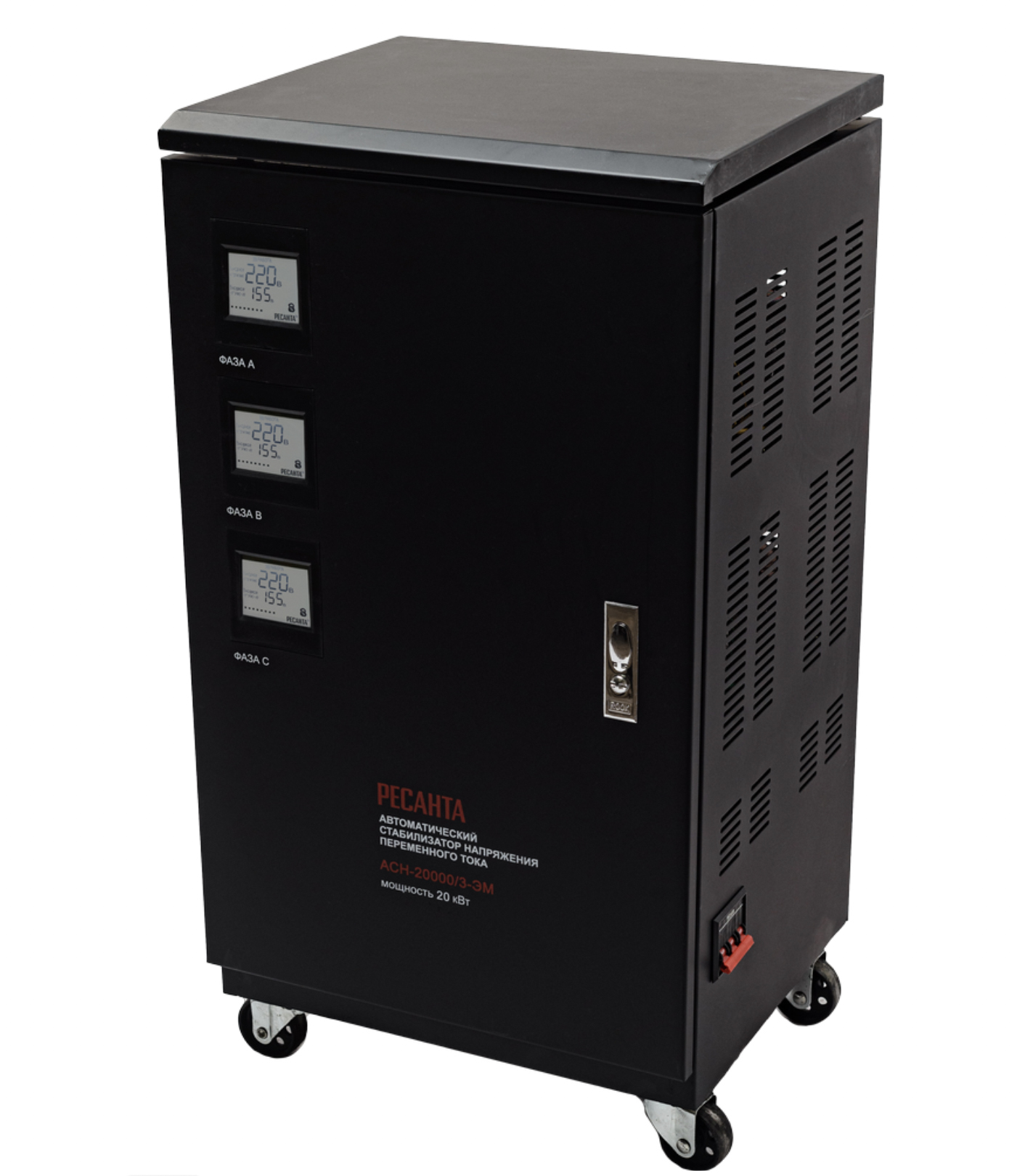 Данный стабилизатор обеспечивает самую точную регулировку напряжения (погрешность до 2%) за счет считывания напряжения с каждого витка катушки. Номинальная мощность при входящем напряжении 190В составляет 20000Вт. Количество фаз = 3. Размещение напольное, есть транспортировочные колеса.